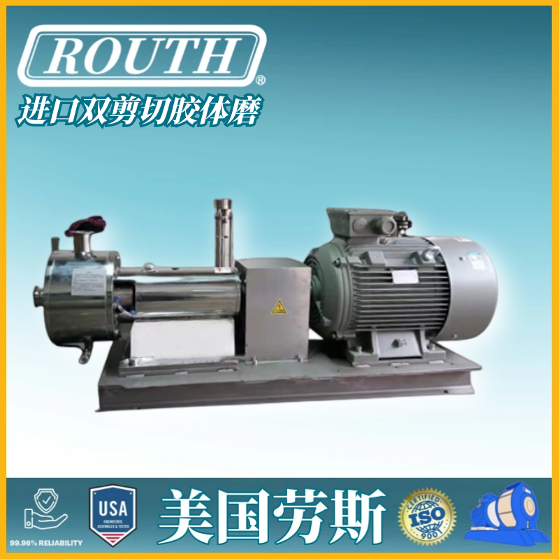 美国劳斯ROUTH进口双剪切胶体磨是一种高效的湿法研磨设备,广泛应用于食品、化工、制药和生物技术等行业。以下是其基本产品信息: